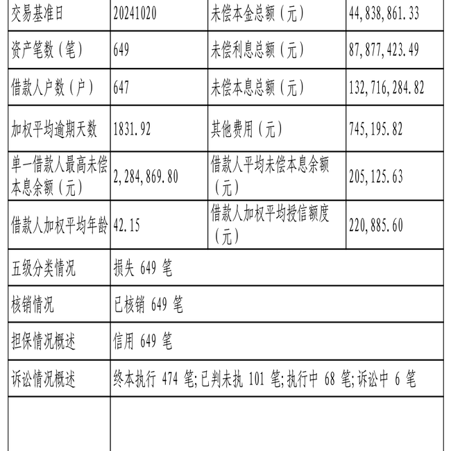公告显示,该笔不良贷款未偿本息总额1.33亿元,涉及资产笔数649笔,借款人户数647户,加权平均逾期天数1831.92天,单一借款人最高未偿本息余额228.49万元。